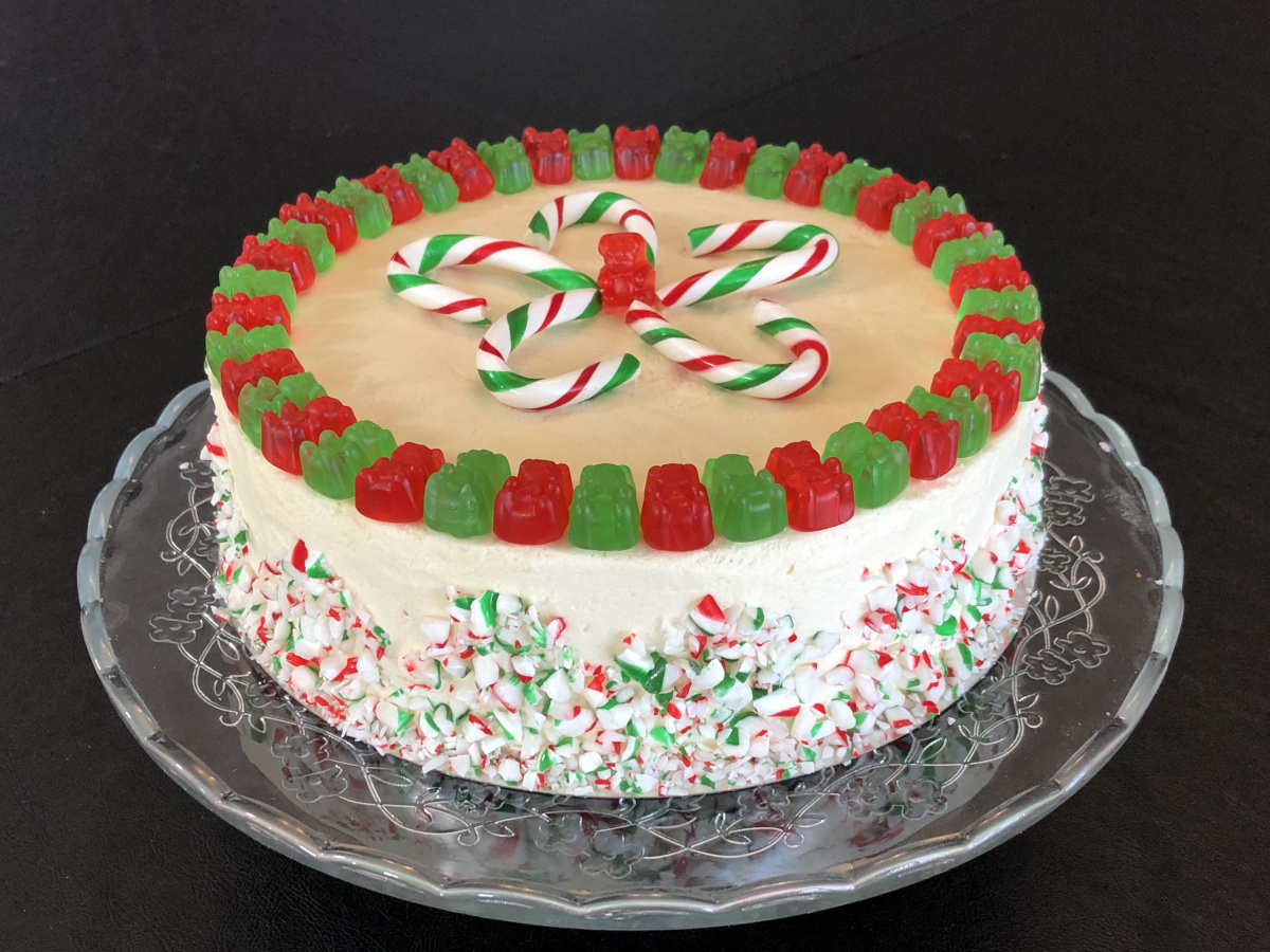 A Christmas Candy Cake, just for fun! It is Nigella's Vanilla Layer Cake with Ermine Icing per the recipe, decorated with crushed/whole candy canes and lined with some gummy bears for a whimsical touch. The kids love it (but so do the adults!)