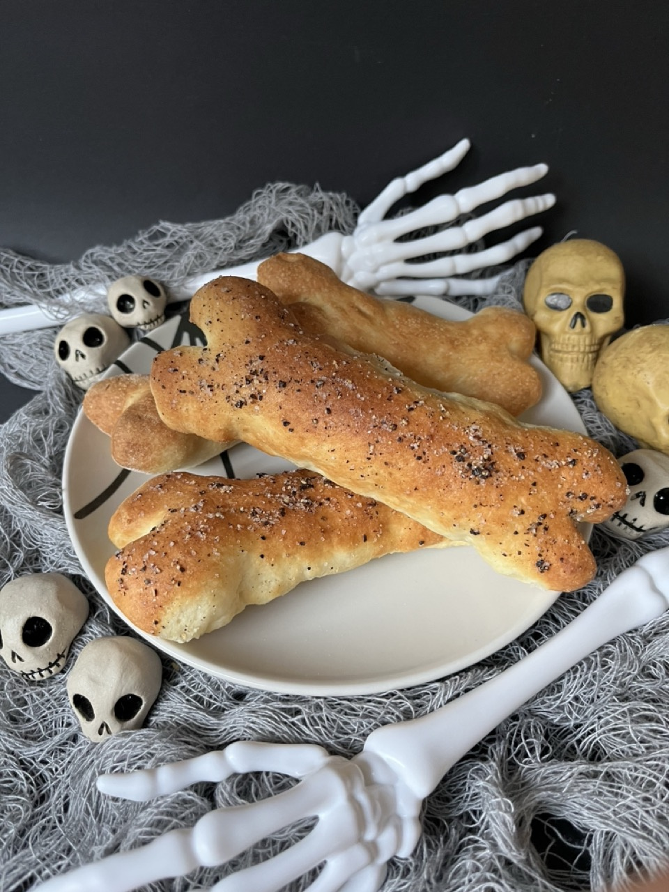 I took Nigella‘s Soft White Dinner Roll recipe and shaped them into bones. Some were left plain, the others got a wash with salt and pepper. Everybody loved them!