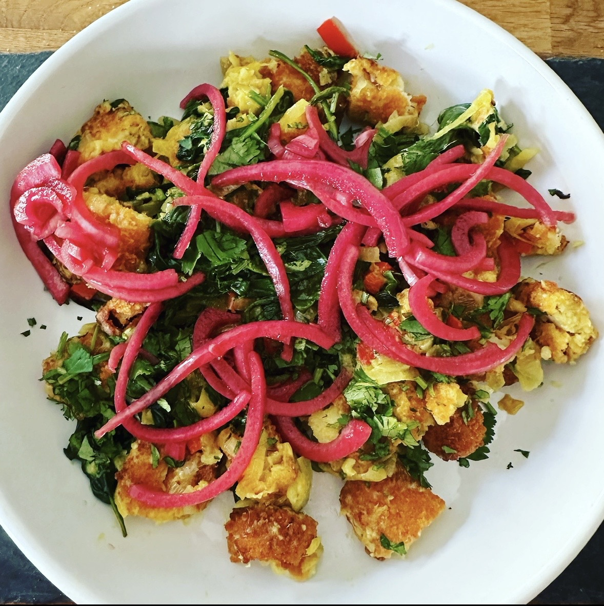 Fish Finger Bhorta from Cook, Eat, Repeat. My husband and I found this as delicious to eat as it looked. The pink pickled onions were a revelation! Will definitely make it again!
