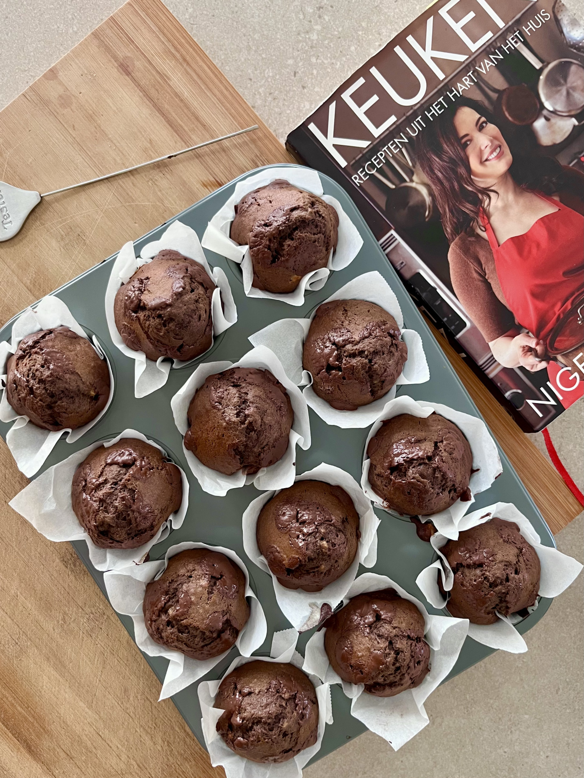 Delicious muffins made with three (over)ripe bananas and cocoa powder. That beautiful round top keeps up even after baking I did add half a teaspoon of sea salt to the batter and some chocolate chips on top. Great recipe and healthy too!