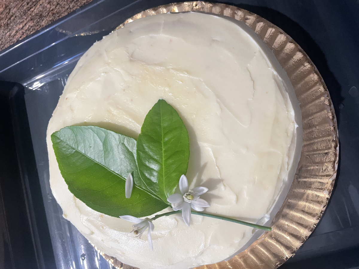 Clementine cake I used oranges and decorated with a cream cheese/white chocolate ganache and a lime blossom sprig from the garden. This was taken to a celiac friend’s 50th birthday celebration and was highly praised for its light texture