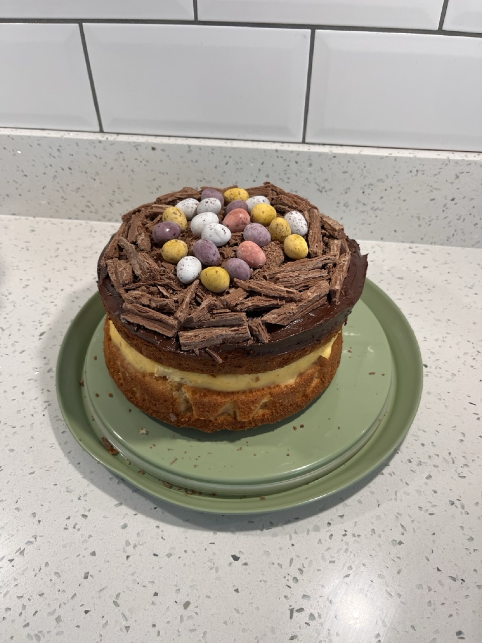 This is a Boston cream pie from How To Eat primped up for Easter . It’s my favourite cake I used flakes for the nest and mini eggs for the eggs !